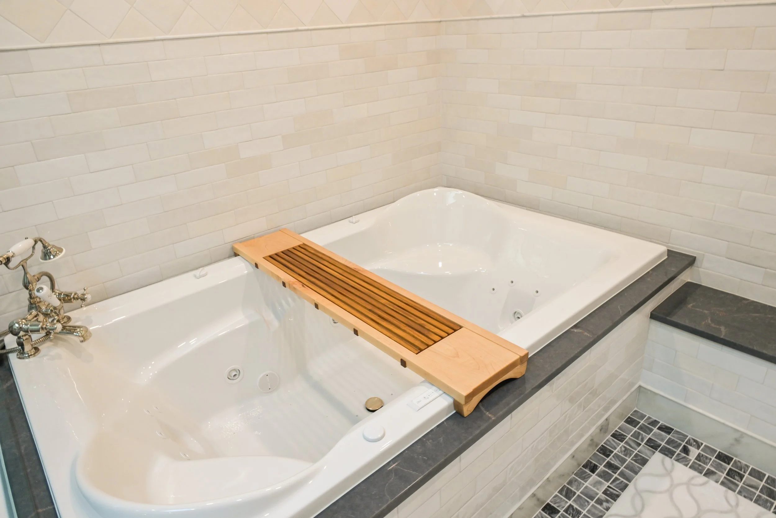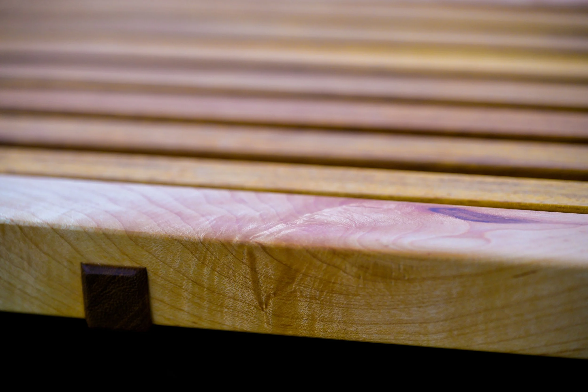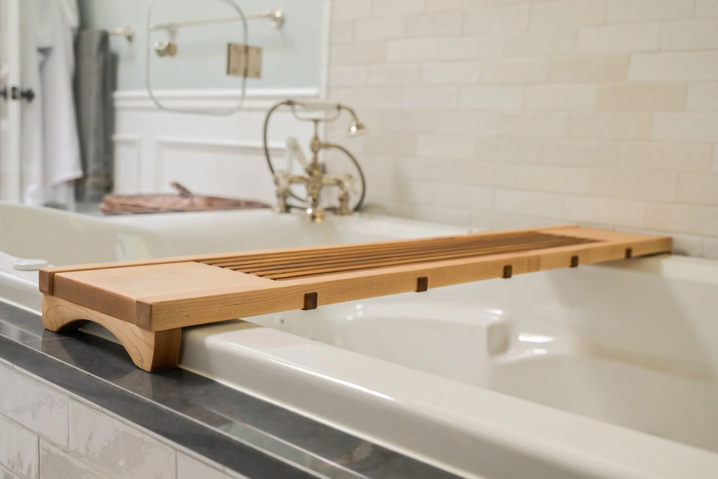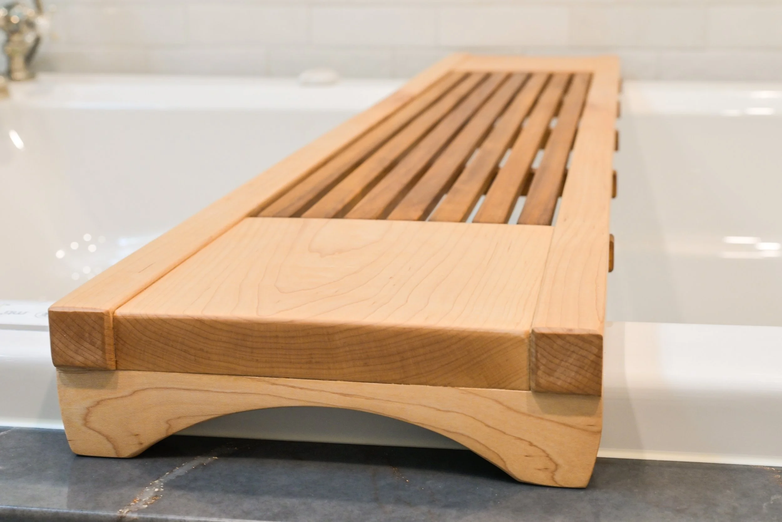 A four-foot wide jacuzzi bath tub demands an equally impressive bath tray to help ward off cold winter evenings. Maple and iroko, custom fit to hug the tub’s edges to prevent mishaps. My favorite part was shaping the five support pieces with their beveled ends extending just beyond the surface of the main rails.